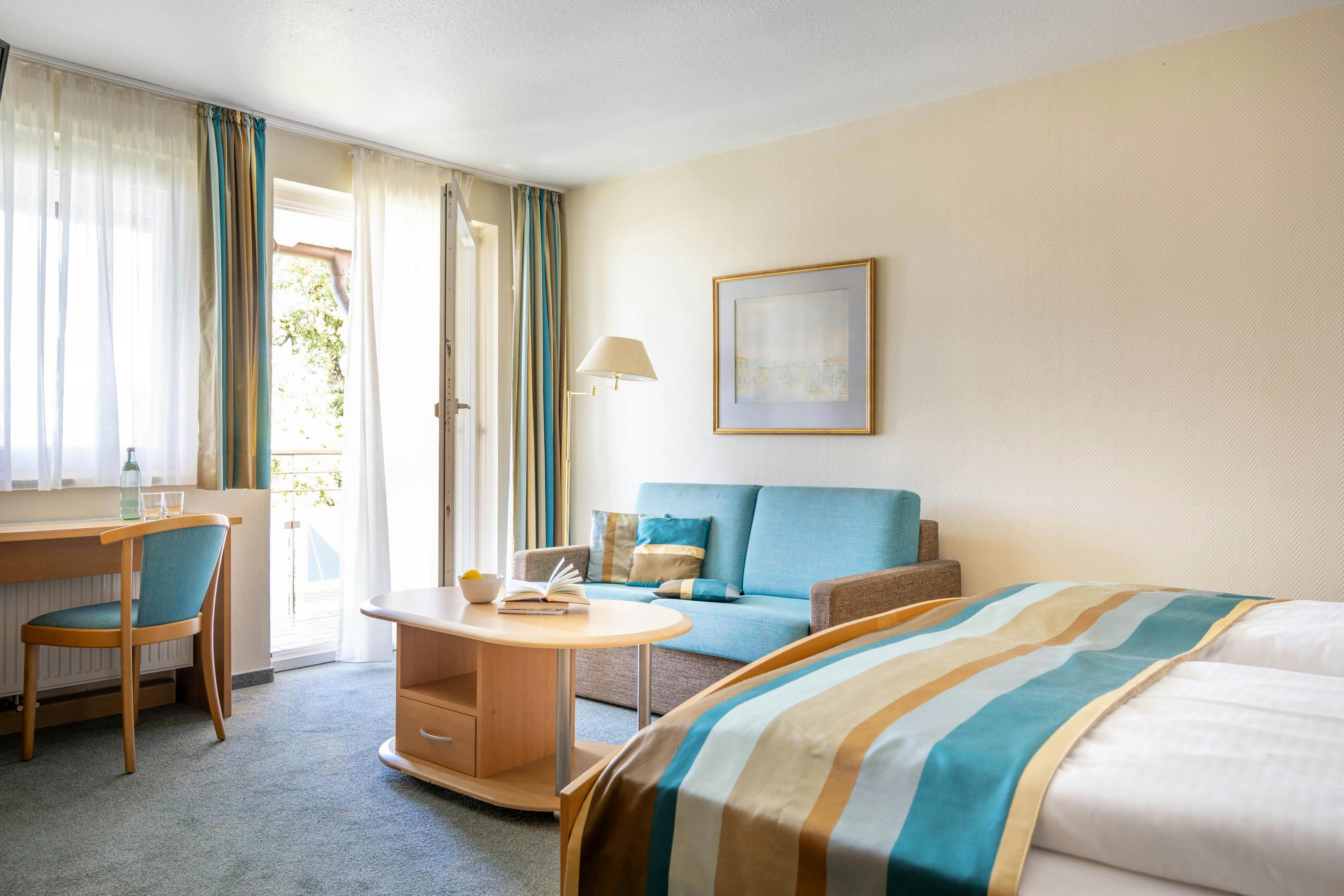 Wer mehr Platz braucht, schwimmt hier in der richtigen Bahn. Unser großzügiges Mehrbettzimmer für bis zu 4 Personen lässt auch die Familienferien entspannt werden.